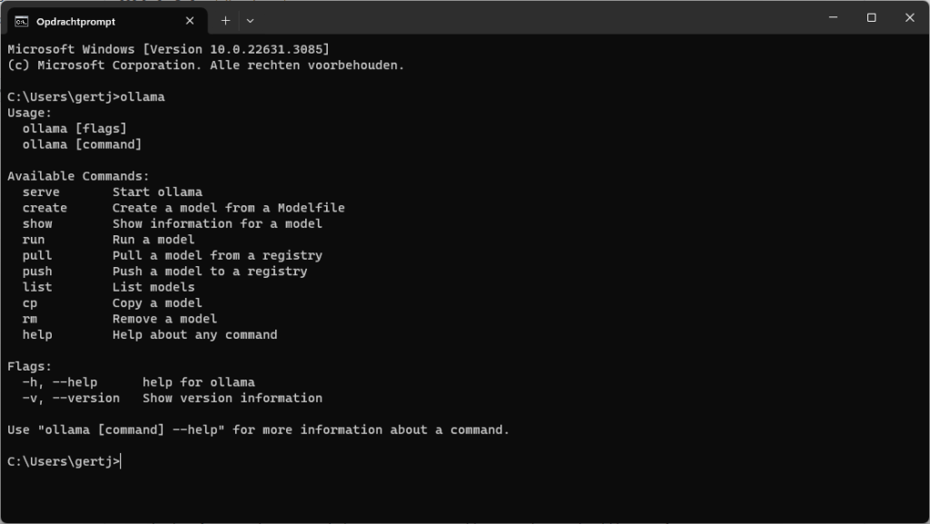 Na een korte wachttijd is het model binnen Ollama beschikbaar. Met ollama list