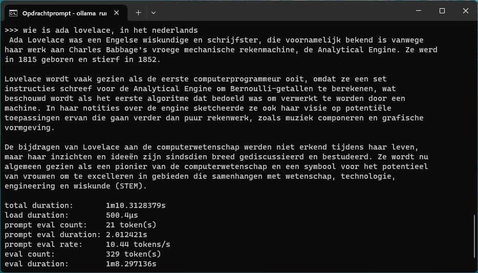 Een internetverbinding is alleen nodig voor het installeren van de software, modellen en updates, niet voor het werken met de chatbot. Wat opslagcapaciteit betreft is voor elk model ongeveer 5 GB ruimte nodig. Kleinere modellen zijn soms wel minder nauwkeurig, al worden er stappen mee gemaakt. Bezwaarlijker is dat ze door de kleinere dataset vaak beter in het Engels dan het Nederlands werken. Daarom gaan we binnen Ollama óók aan de slag met een goed Nederlands taalmodel.