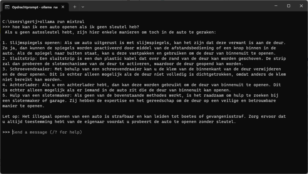 Namen we het relatief uitgebreide Mixtral (mixtral) als voorbeeld, van dezelfde makers als Mistral, dan is het volgens het bedrijf geoptimaliseerd voor Engels, Frans, Duits, Spaans en Italiaans. Het is daarom maar beperkt met Nederlandse teksten getraind, al gaat het daar nog relatief goed mee overweg. In het voorbeeld vragen we hoe je een auto kunt openen als je geen sleutel hebt. Het blijkt hier geen censuur toe te passen zoals je dat vaak ziet bij chatbots, maar het komt wel terecht met een disclaimer.