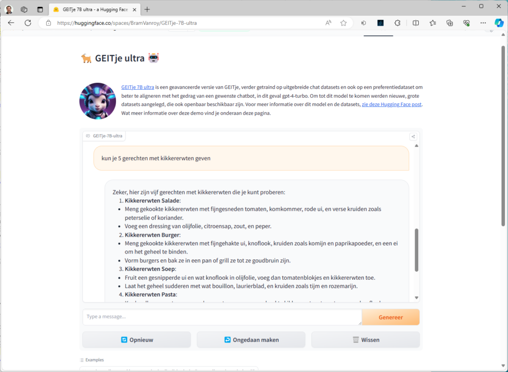 Van GEITje zijn overigens ook twee chat-varianten gemaakt onder de namen GEITje-chat en GEITje-chat-v2. Verder is er een ‘ultra’ variant gemaakt door Bram Vanroy, onderzoeker aan de KU Leuven. Deze variant is nog verder getraind op chat-datasets. Via Hugging Face kun je eventueel demo’s voor deze modellen proberen (zie bijvoorbeeld https://huggingface.co/spaces/BramVanroy/GEITje-7B-ultra). De chatbots kunnen instructies opvolgen, vragen beantwoorden en dialogen houden over allerlei onderwerpen.