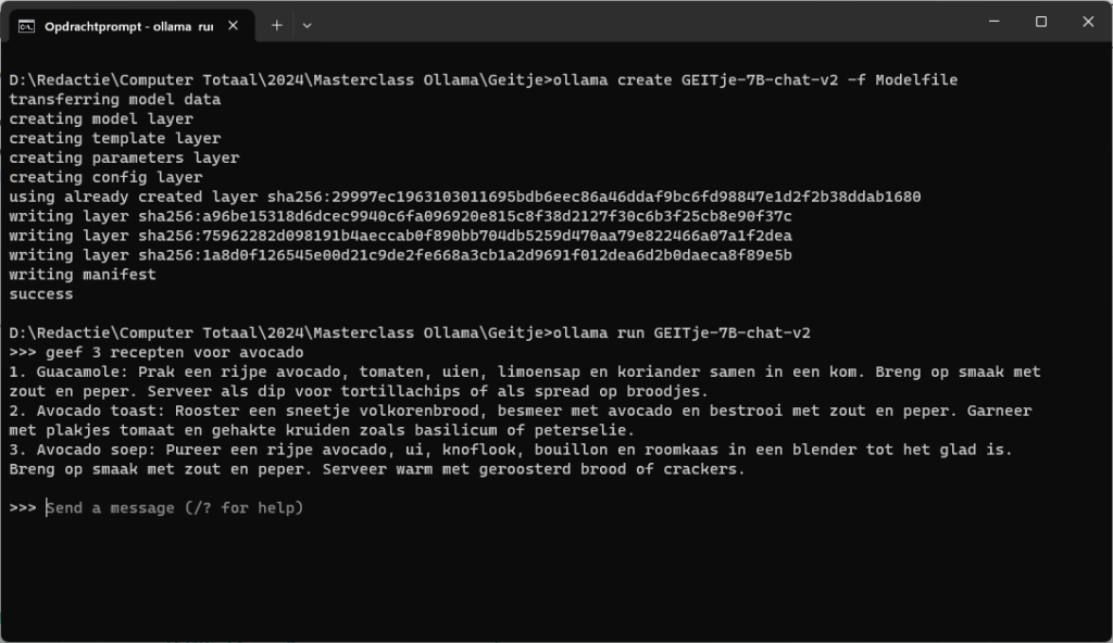 kun je dat controleren. Je gebruikt het model vervolgens met ollama run GEITje-7B-chat-v2