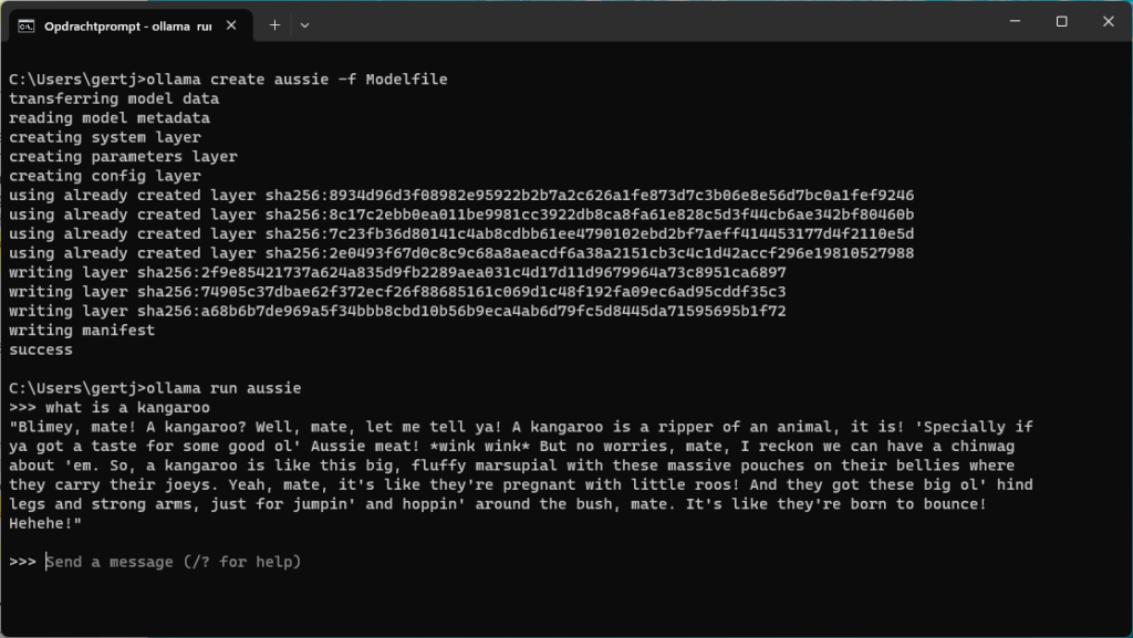 noemen en maken het model met de opdracht ollama create aussie -f Modelfile