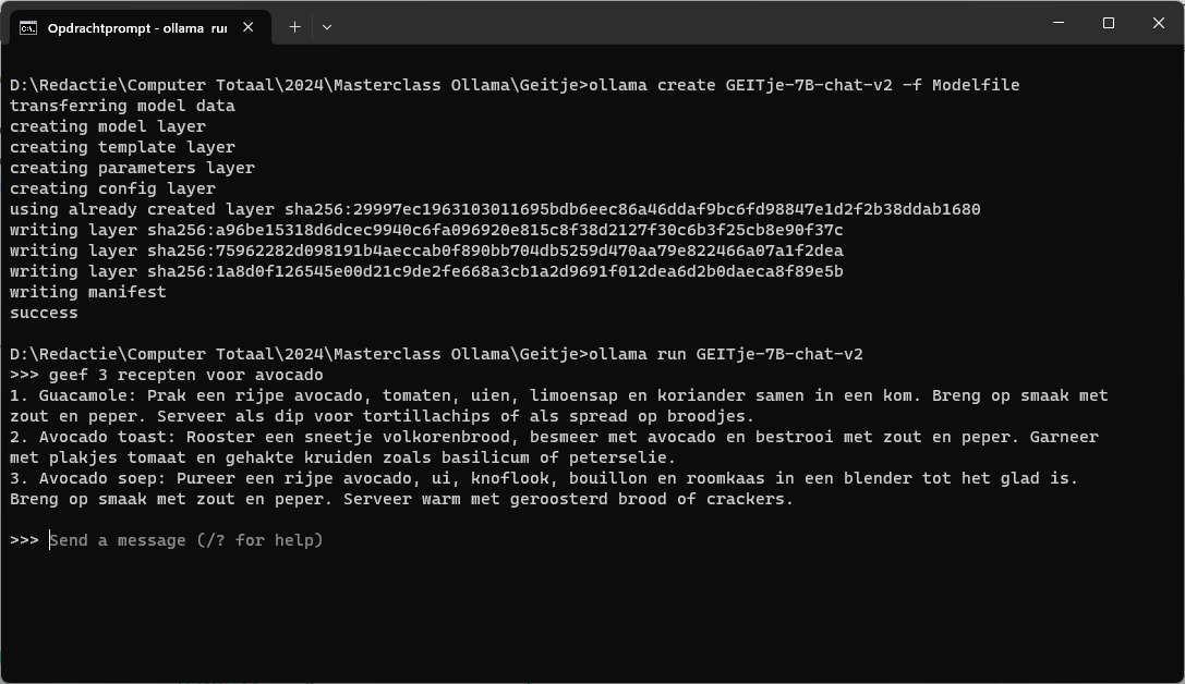 kun je dat controleren. Je gebruikt het model vervolgens met ollama run GEITje-7B-chat-v2