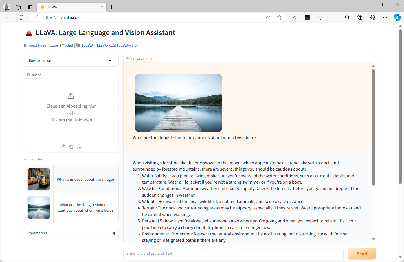 . Daarna kun je een vraag stellen en daarin een bestandslocatie van een afbeelding meegeven. Er is ook een online demo op https://llava.hliu.cc waar je de voorbeelden kunt bekijken of een afbeelding kunt uploaden en een eigen prompt invoeren.