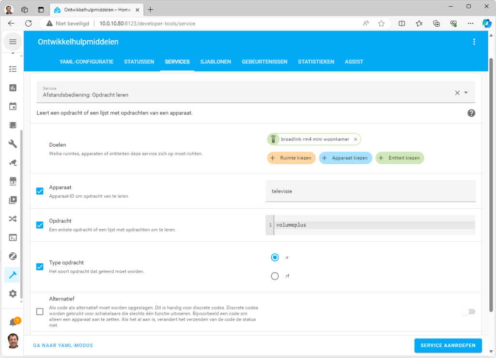 Ga om te beginnen naar Ontwikkelhulpmiddelen / Services. Kies Afstandsbediening: Opdracht leren. Klik achter Doelen op Entiteit kiezen en selecteer de zojuist toegevoegde afstandsbediening. Zet een vinkje bij Apparaat en vul een naam in voor het apparaat dat je gaat bedienen, zoals televisie. Zet ook een vinkje bij Opdracht en voer een naam voor de opdracht in, bijvoorbeeld volumeplus. Klik dan op de knop Service aanroepen. Richt de afstandsbediening op de hub en klik op de bewuste button van de afstandsbedieing. De knop Service aanroepen wordt groen ter bevestiging.