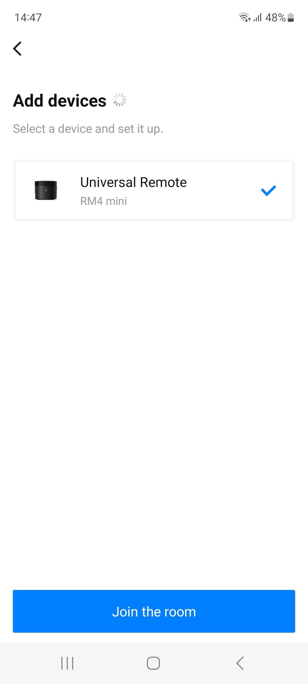 Je hebt de Broadlink-app alleen kort even nodig om de hub in gebruik te nemen. Daarna kun je commando’s leren en versturen met Home Assistant. Open de Broadlink-app en begin met het maken van een account. Kies daarna Add device / Wi-Fi device / Universal Remote / RM4 mini en volg de instructies. Nadat je verbinding maakt met de wifi-hotspot van de RM4 mini kun je jouw wifi-netwerk instellen om de hub in gebruik te nemen. Selecteer dan het gevonden apparaat en klik op Join the room. Kies de ruimte waarin je de hub gebruikt. Voltooi de wizard om de installatie af te ronden.