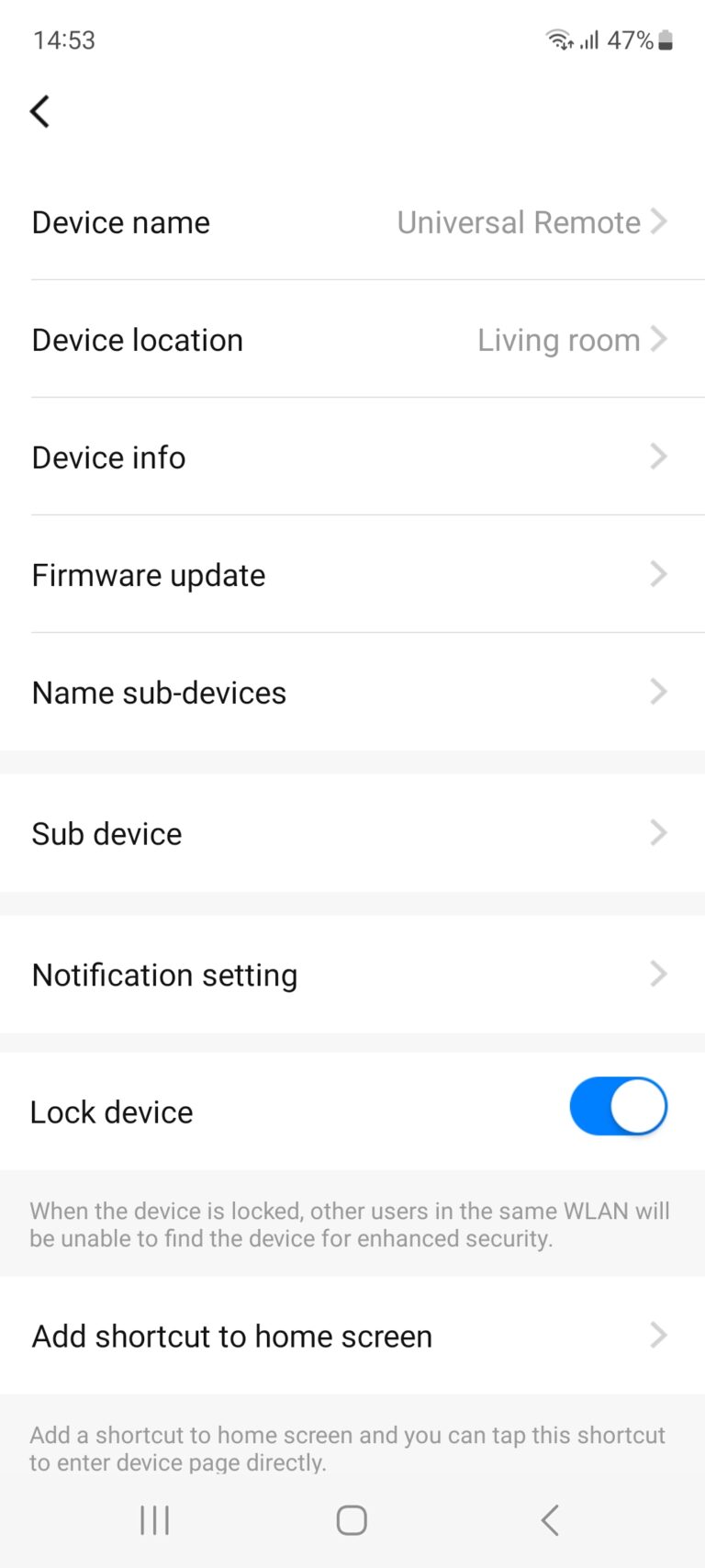 Open dan voor het betreffende apparaat het menu (via de drie puntjes rechtsboven) en kies Property. Haal het vinkje weg bij Lock device. Dit zorgt ervoor dat je de hub kunt gebruiken met andere systemen, zoals Home Assistant. Je zou vanaf hier de app kunnen gebruiken om commando’s van je afstandsbediening te leren, maar als je voornamelijk met Home Assistant gaat werken is dat niet nodig, en zelfs extra werk. Je kunt de met de app geleerde commando’s namelijk niet overbrengen.